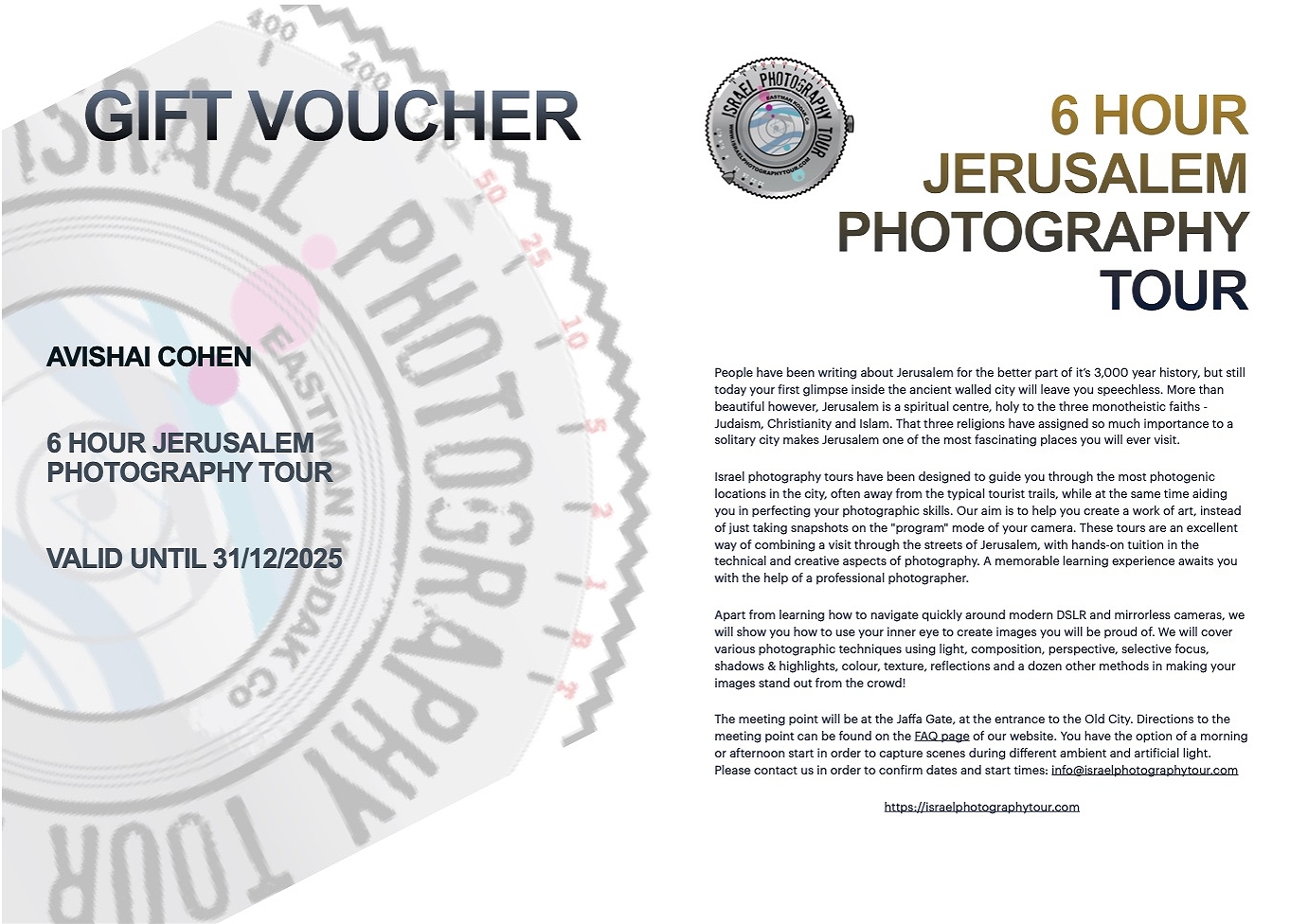 The ultimate gift for photographers: Unforgettable photography tours in Israel Israel Photography Tours are delighted to offer gift vouchers for relatives and friends of photographers visiting the Holy Land with their camera. Photo enthusiasts can enjoy a unique gift of an educational and inspiring learning experience. We...