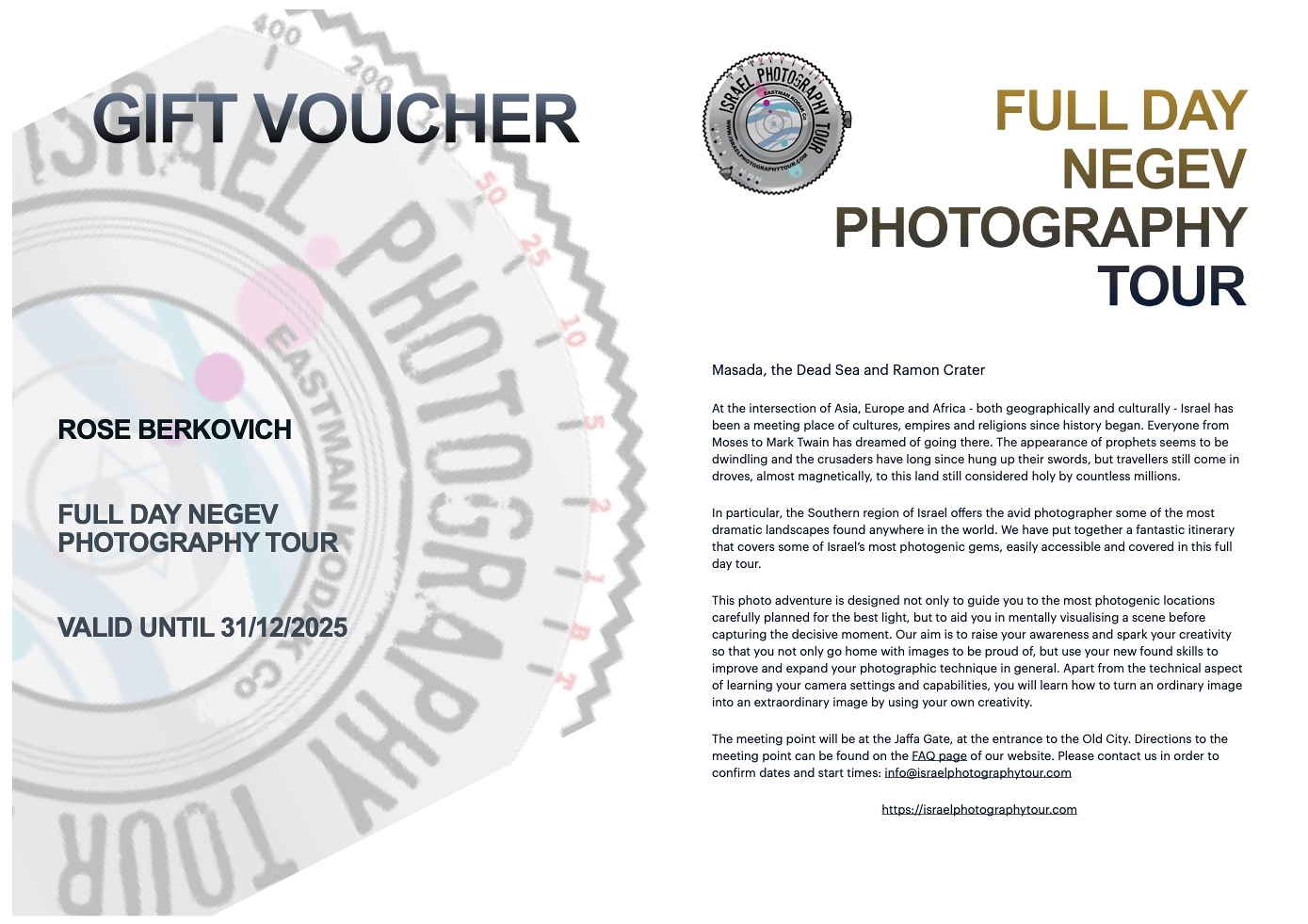 Israel Photography Tours are delighted to offer gift vouchers for relatives and friends of photographers visiting the Holy Land with their camera. Photo enthusiasts can enjoy a unique gift of an educational and inspiring learning experience. We offer various itineraries, including our popular 3 hour Tel Aviv photography tours and 6 hour Jerusalem photo tours. A customised gift voucher stating the person’s name and itinerary can be printed off or sent as an eGift voucher. It can be sent by email immediately or on a specific date. Company incentives and rewards to employees are also often sent as corporate gifts with great success.